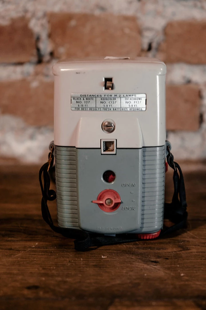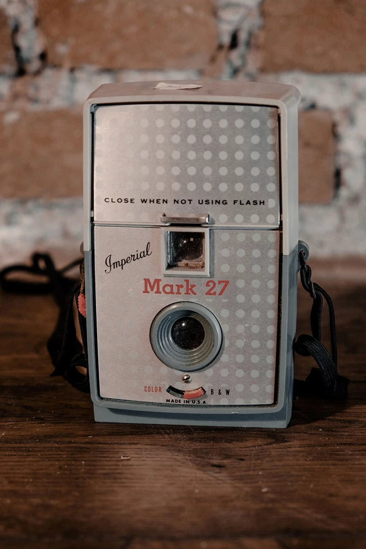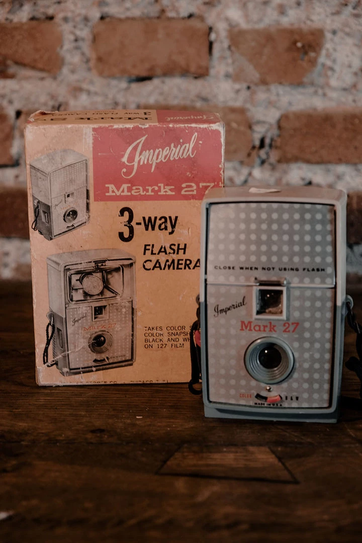 The Imperial Mark 27 is a nifty plastic camera made by the Herbert George Co. of Chicago, probably in the 1950s. It’s called a “3-way flash camera” on the box, and a “3-in-1 hideaway flash camera” on the instructions. Apparently, this is because the camera can: – Take color slides – Take color snapshots – Take black & white snapshots