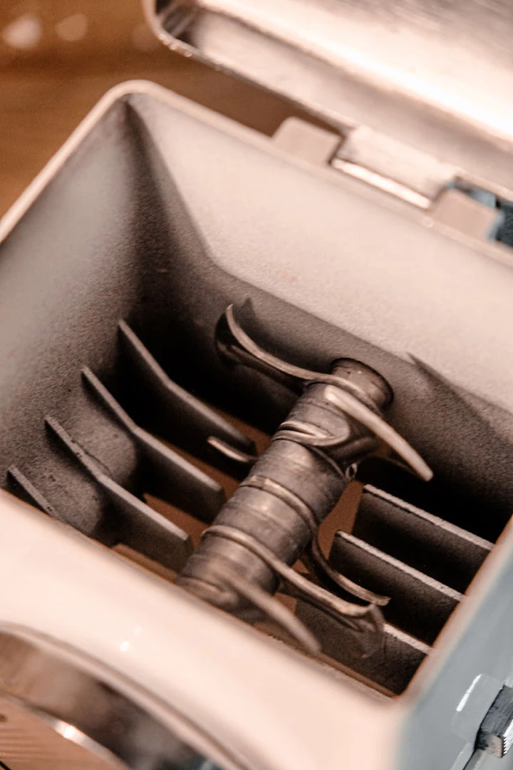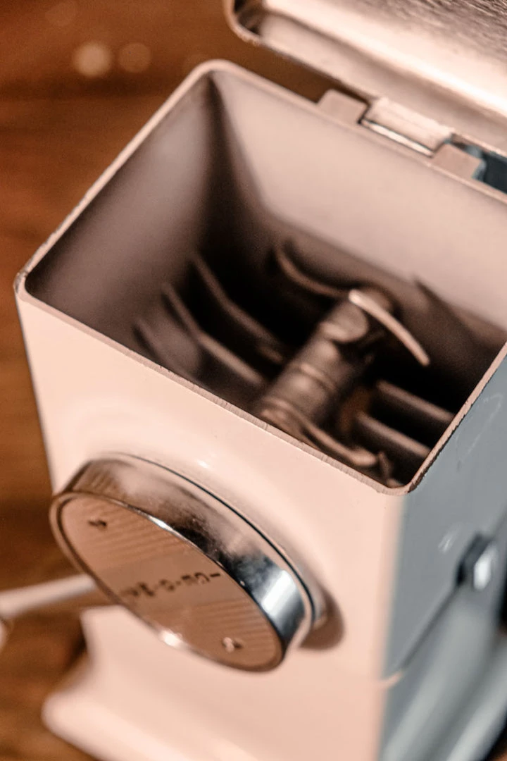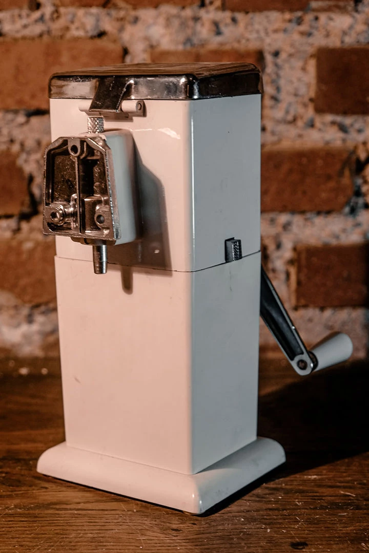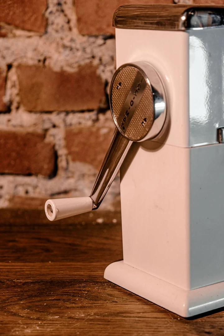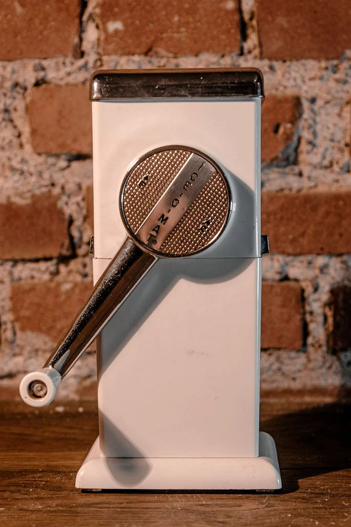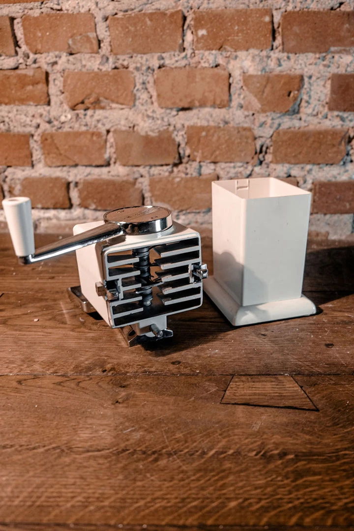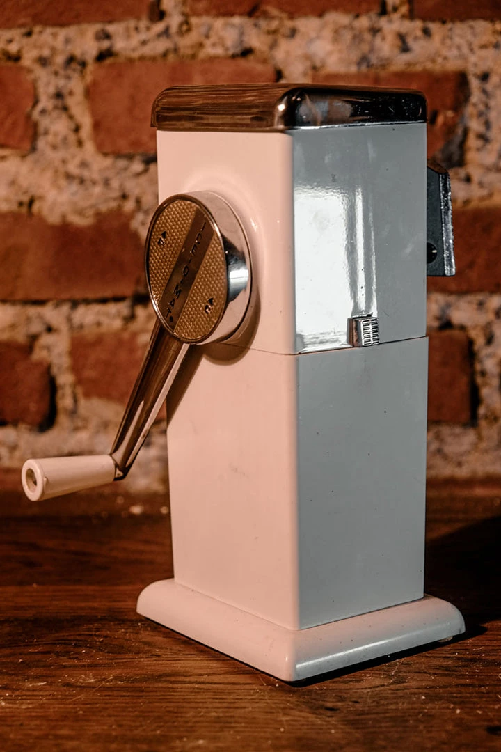 This Mid Century Modern Ice Crusher, Ice Chopper by Ice O Matic in white features metal blades for crushing or chopping ice, a removable ice container made of plastic, and a chrome top and handle with an ivory plastic tip. It was designed to be used on a tabletop or wall hung.