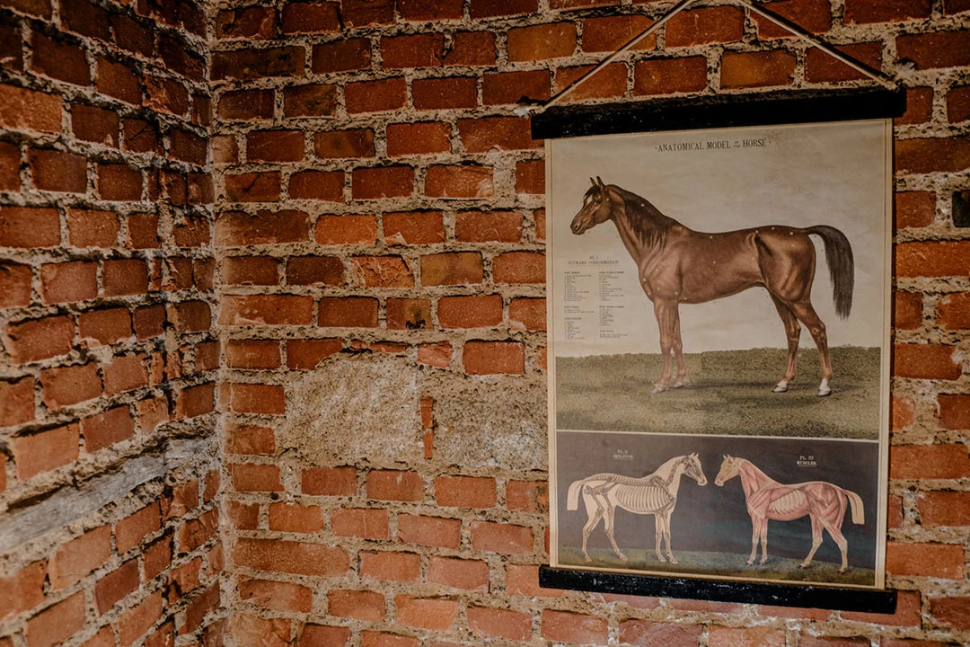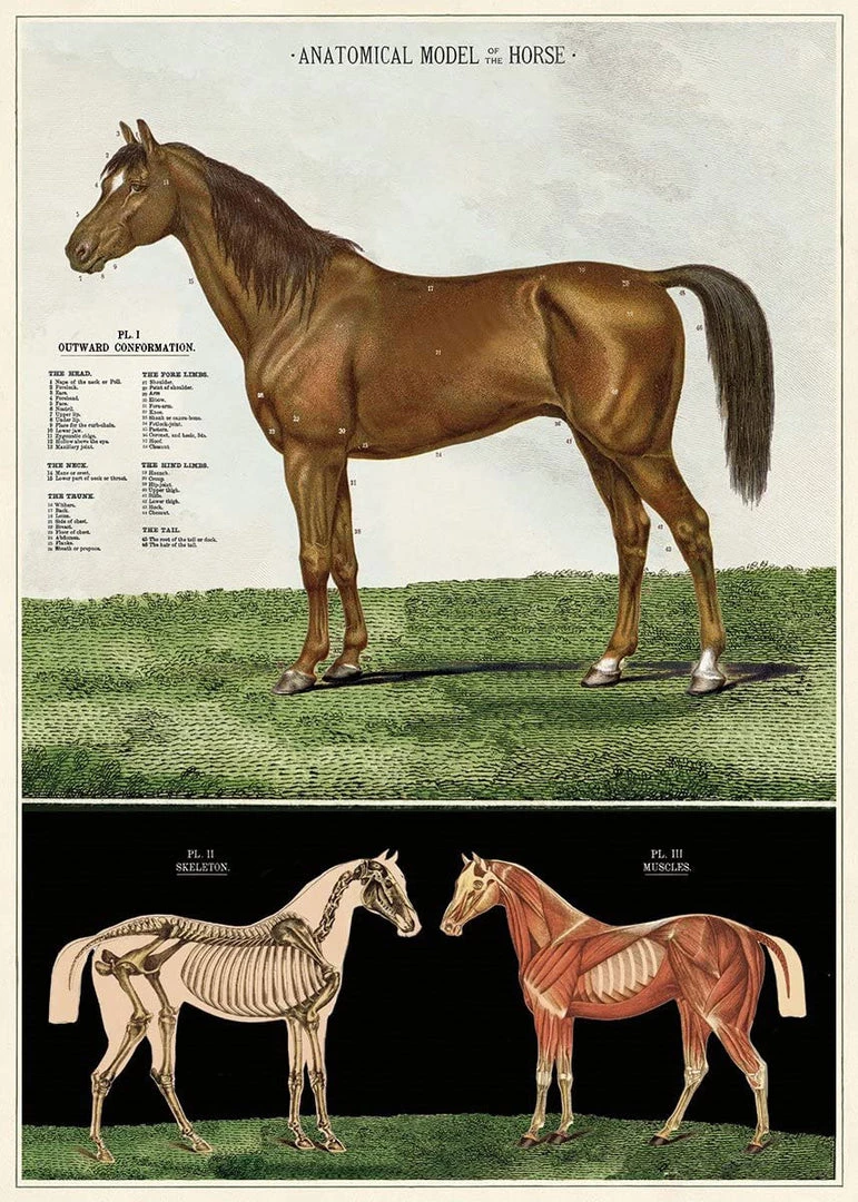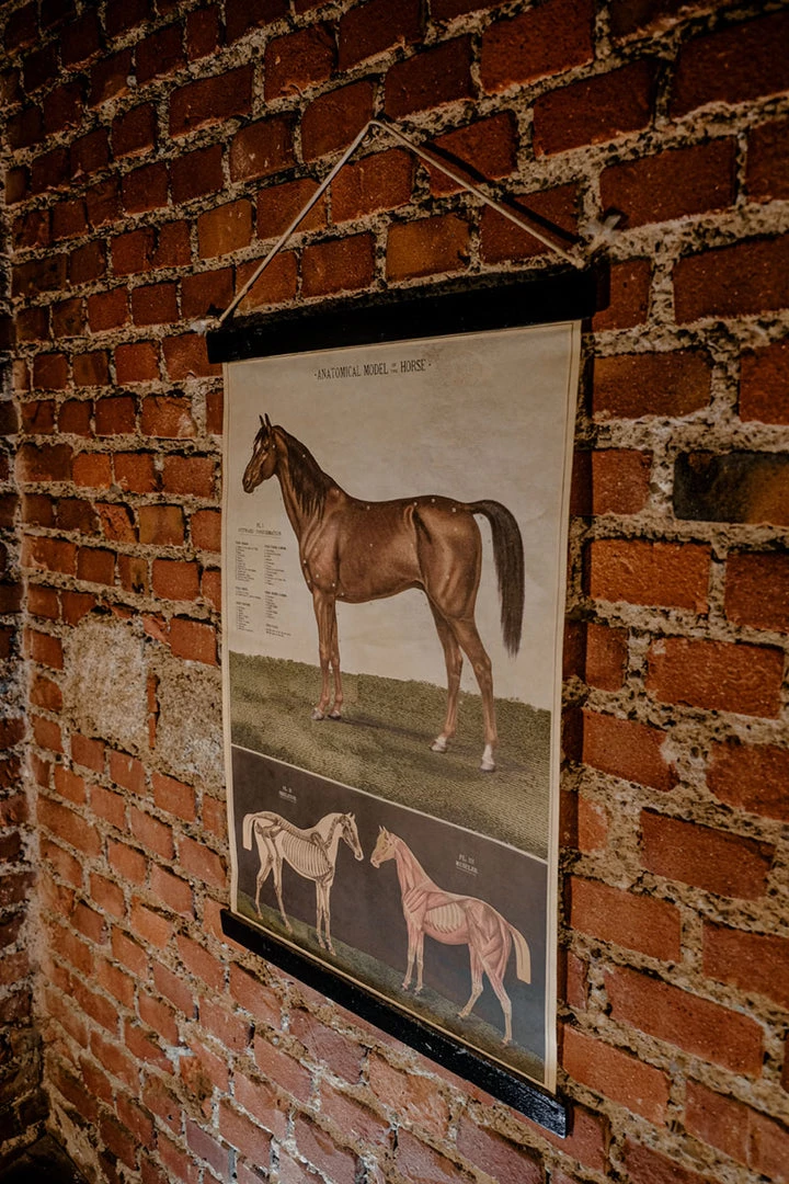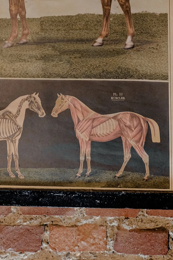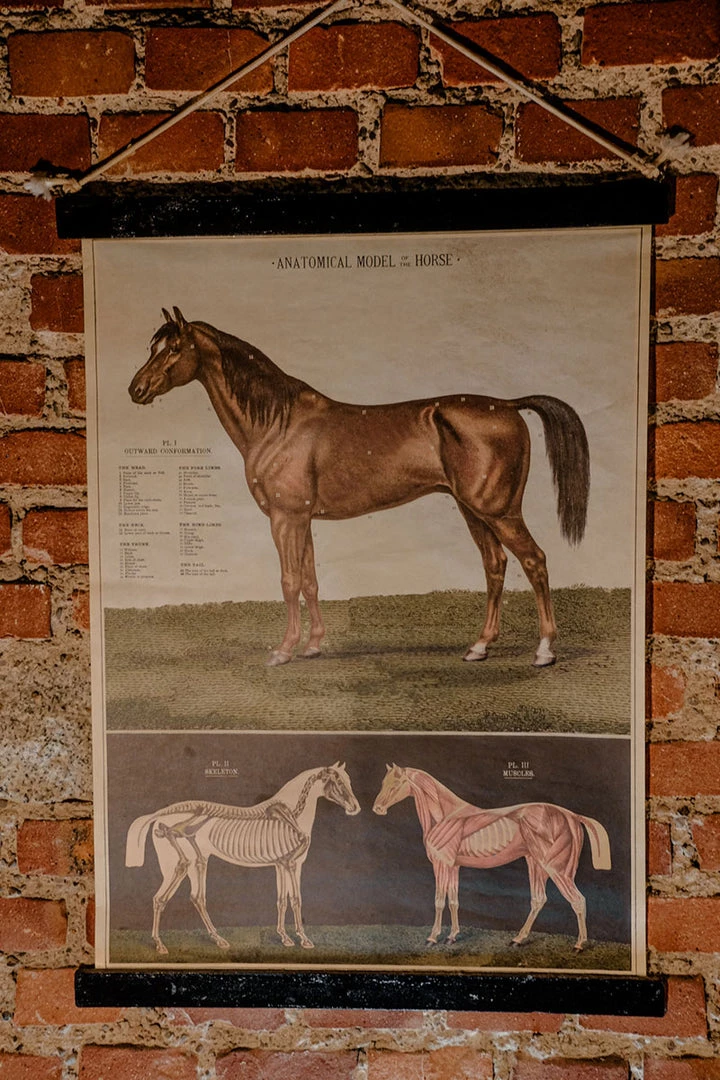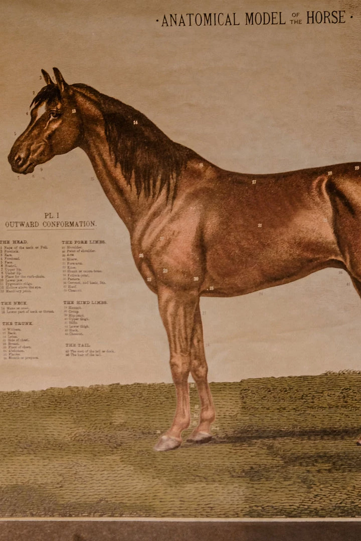 Stunning reproduction of Anatomical model of the horse vintage chart with wooden hangers. Highlights the anatomical features of the horse.