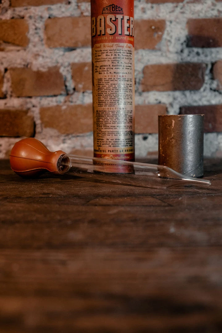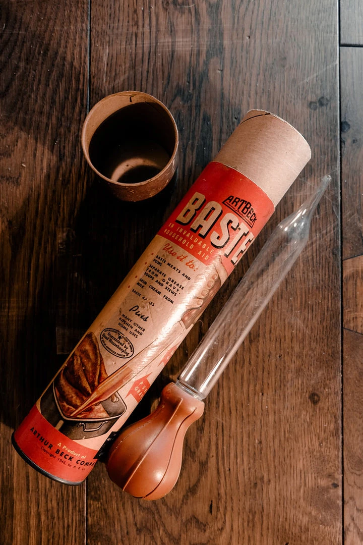 1946 Arthur Becks Pyrex glass turkey/chicken baster in its original box with leaflet.