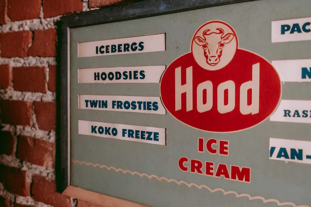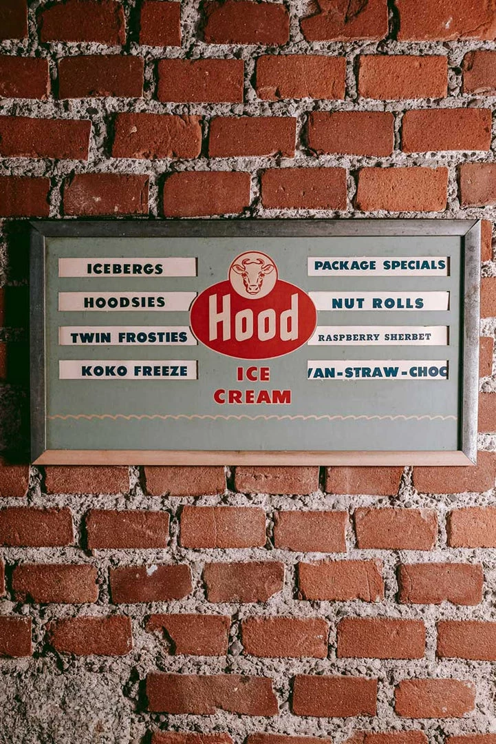 This is a sign of an old ice cream parlor, offering Hood Ice Cream. 1950 Circa.