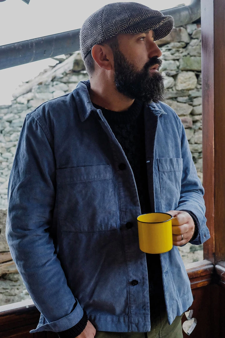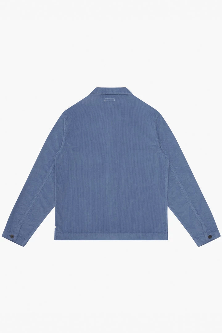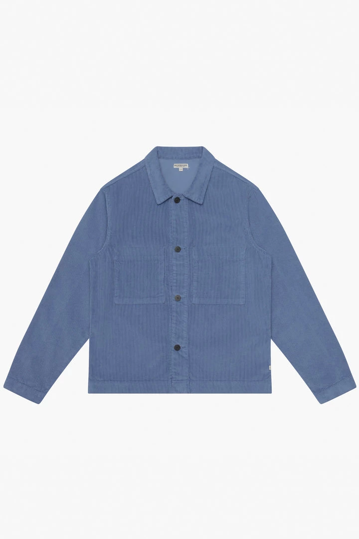 The Chore Shirt in French blue. Made of a brushed cotton corduroy. Features two chest patch pockets, adjustable cuff and melamine buttons.