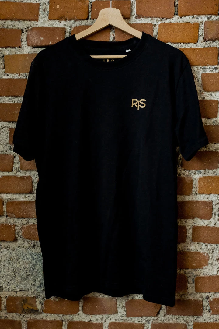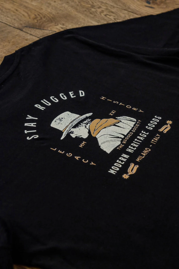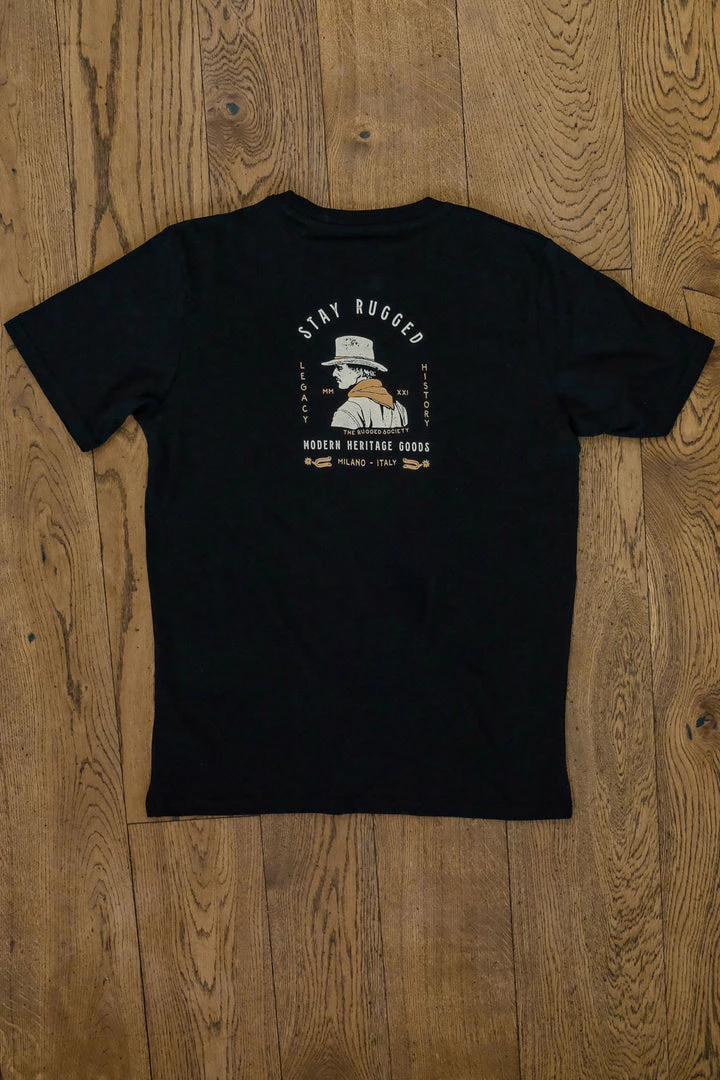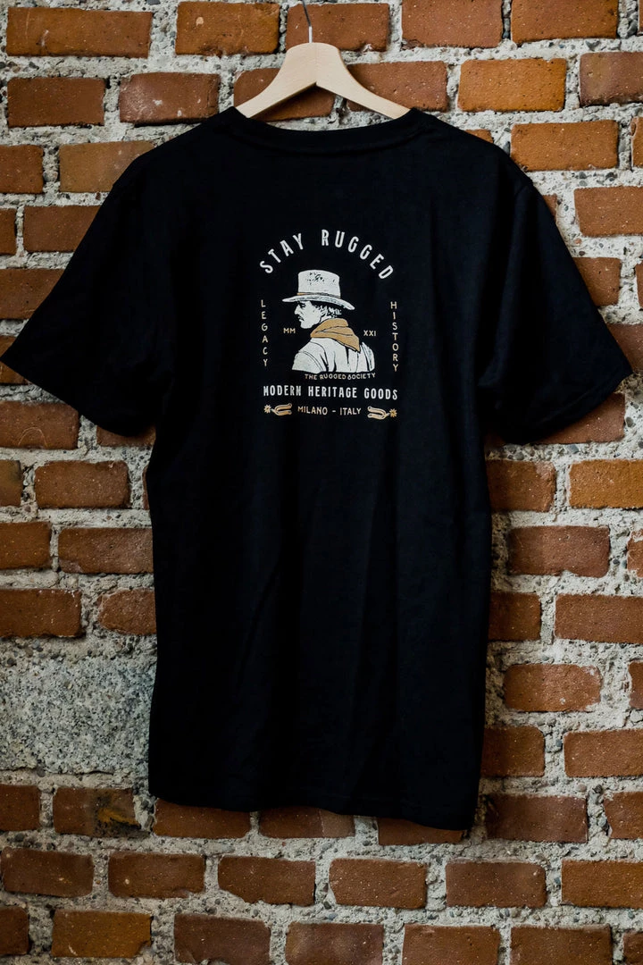 A The Rugged Society Heavy Weight T-Shirt. It’s a 220 G/M² and 100% Black Organic Ring Spun Combed Cotton Tee. Medium fit.