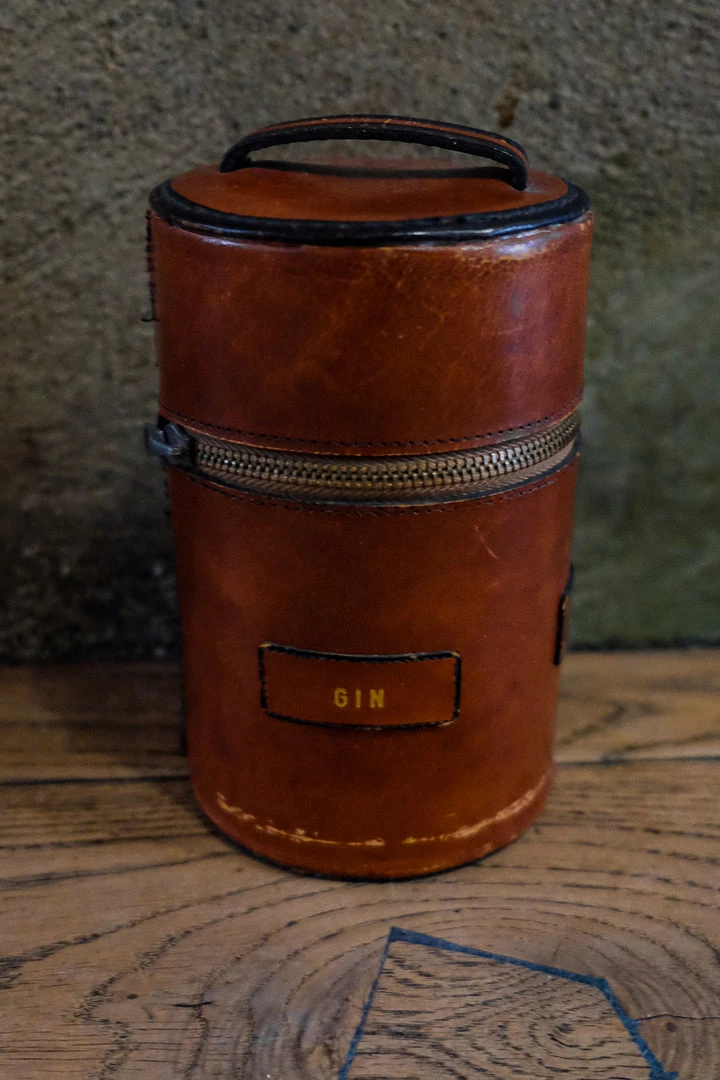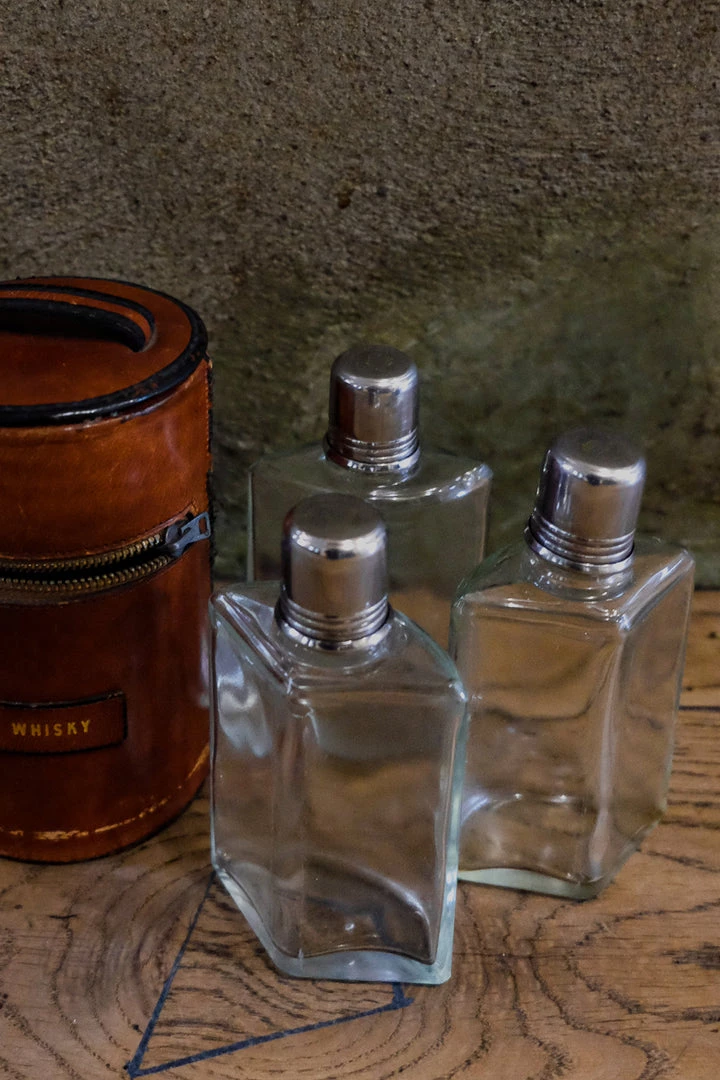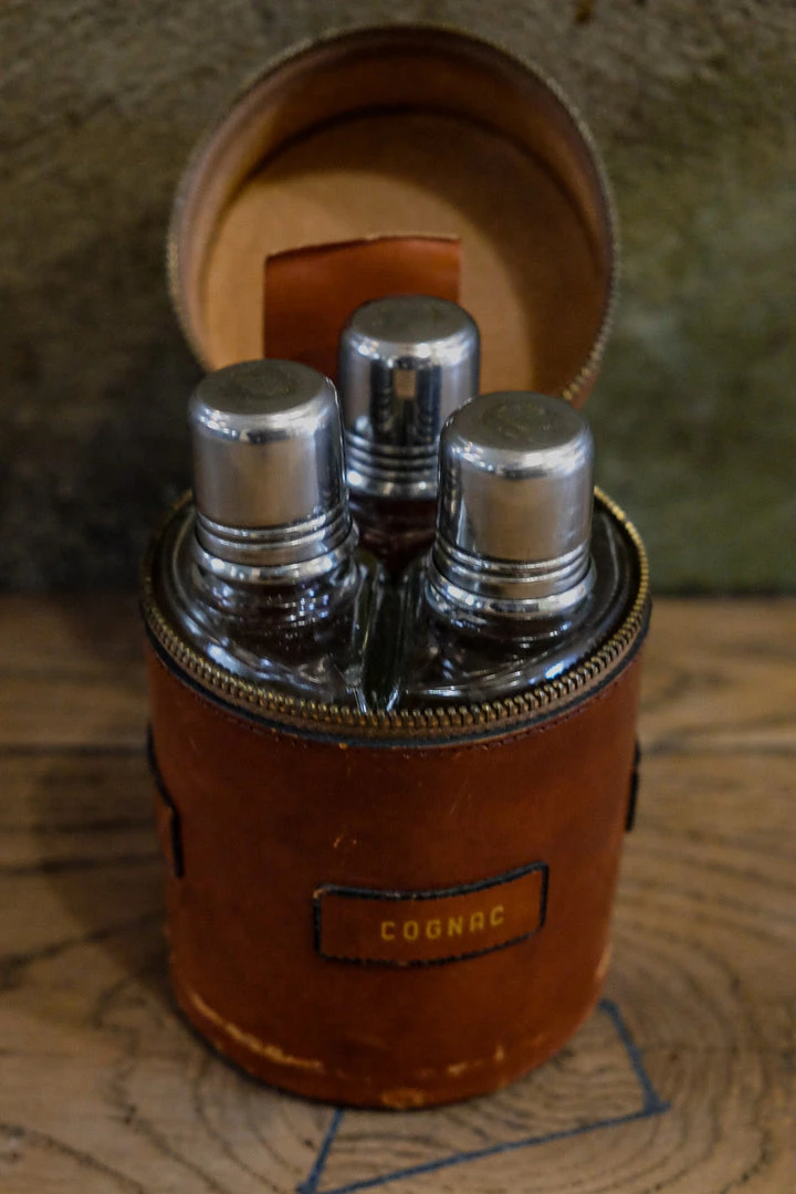 A great travel kit for your outdoor adventures. It features a zipped cylindrical vintage leather case with three 100 ml glass flasks inside for Whisky, Gin and Cognac. Excellent conditions.