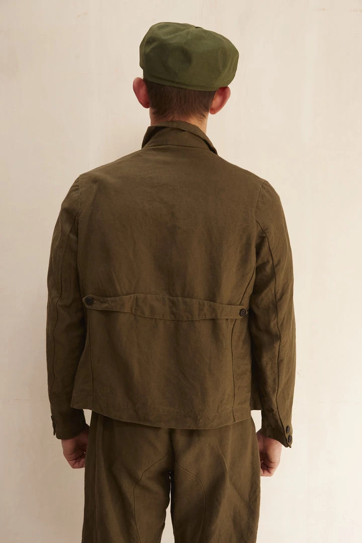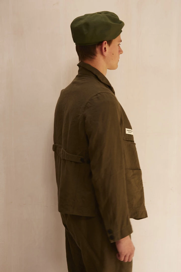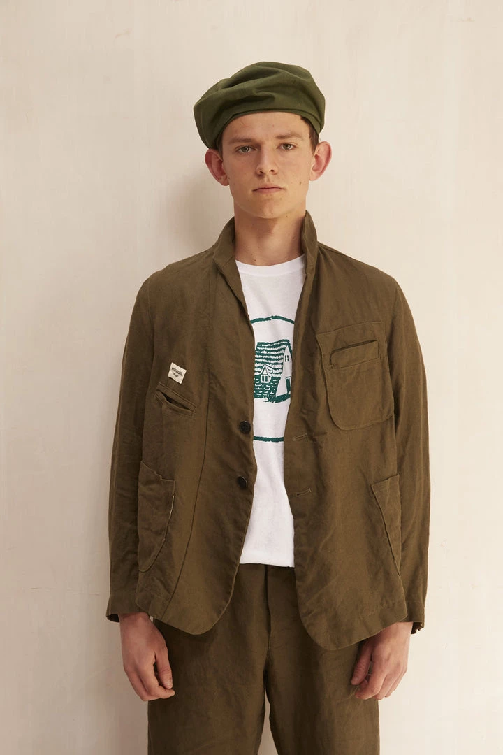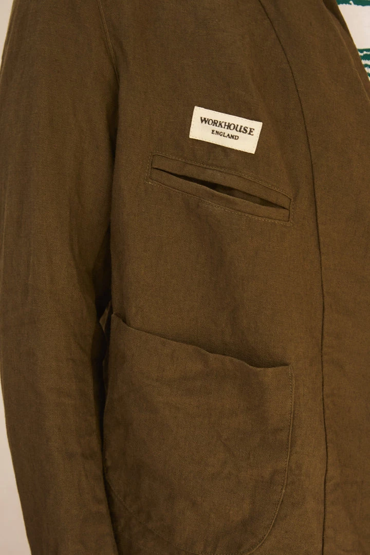 A Workhouse Classic heavy mix of pockets. It is a summer blazer but it is no ordinary one. There is a tilt cut into the shape of the jacket so the front is low and larger and the back is higher to give a casual feel and not a tailored one